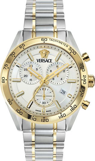 Refined opulence and iconic Versace style exude from this chronograph watch fitted with a sunray dial, three sub-eyes and a 3D Medusa head for signature allure.