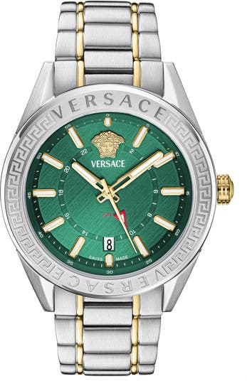 Logomania, done subtly and not so, defines this GMT watch's style, from the Greek-key–engraved bezel to the 24-hour-marked dial featuring a 3D Medusa-head icon at high noon.