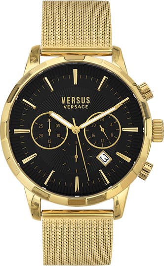Tapered hands flow into the radiating guilloche dial of this day-to-night chronograph stylized by bold hands, a faceted bezel and a sleek mesh band.