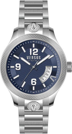 Signature lions head medallions add signature style to a chunky link bracelet strap around a diamond-cut textured quartz watch.