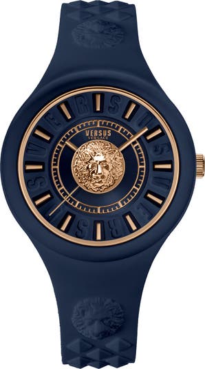 Lion head emblems and pyramid shaped studs accent this silicone strap watch complete with gold-tone finishes from Versace.