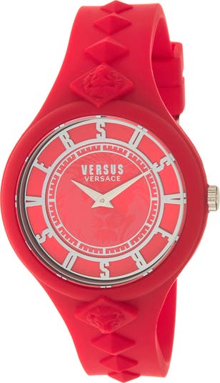 A sunray dial with a lion motif is overlain with a silver-tone logo from Versace when you sport this tonally studded silicone watch.