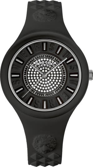 Pavé crystals dazzle against the dial of a silicone strap watch with a tonal logo and signature lion head motif from Versace.