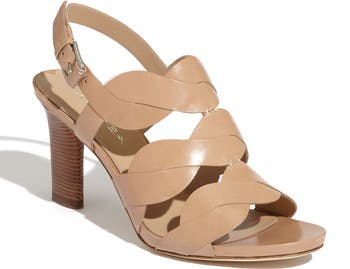 Oversized twists style a summery sandal lifted by a sleek stacked heel.