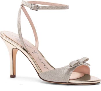 A delicate bow and metallic upper amplify the occasion-ready charm of a cushioned sandal lifted by a stiletto heel and secured with a slim ankle strap.