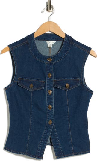 An inky rinse gives a more dramatic look to a denim vest that can be worn solo or layered over other casual favorites.