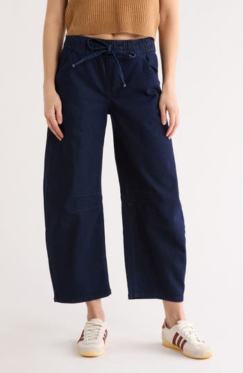 A drawstring waist allows you to achieve a perfect fit in these casual jeans made with barrel legs and cut to an abbreviated length.