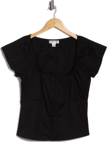 A milkmaid-inspired bodice defines a short-sleeve top made from low-stretch cotton for day-to-night comfort.