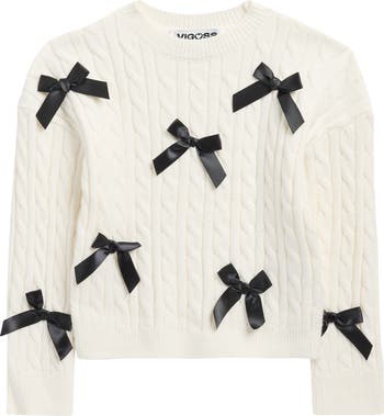 Dimensional bows bring coquettish vibes to a crewneck sweater stitched with braided cables for classic cold-weather appeal.