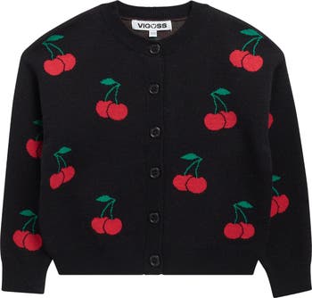 Sweeten their style with this buttoned cardigan playfully patterned in cheerful cherries.