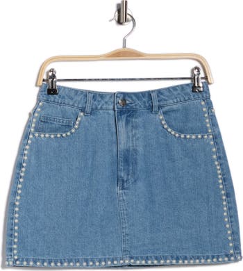 Pearly studs frame this classic miniskirt cut from cotton-blend denim in a perfectly faded wash.