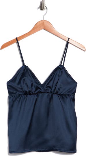 Adorable bows and wavy lace trim bring a charming touch to this satin camisole finished with underbust stitching.