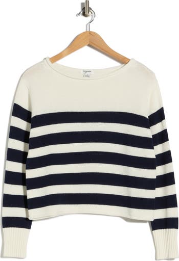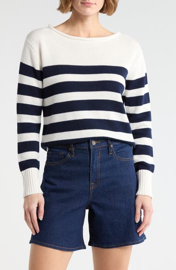 Neutral stripes lend classic style points to a boat-neck sweater made from a soft cotton blend that's lightweight and easy to layer.