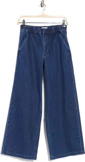 Mix casual and elevated with these lightweight, nicely draped denim jeans flaunting a super-high waist, slanted front pockets and wide, full-length legs.