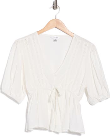 This V‑neck peasant top features elbow‑length sleeves and a waist tie that creates a relaxed silhouette with an adjustable, flattering fit.