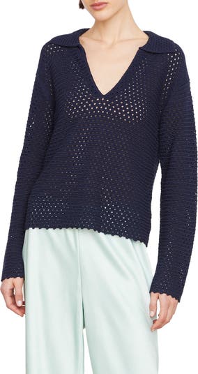 Long sleeves and a spread collar frame an airy openwork sweater crafted from textured cotton for trend-right appeal.