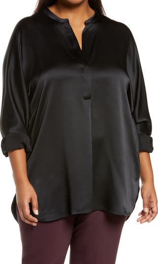 This luxe tunic blouse is crafted from rich silk with a split neckline and a curved shirttail hem.