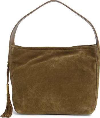 Logo-engraved hardware and a fringe tassel add edgy appeal to this suede leather satchel with a spacious interior.