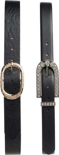 Goldtone etched hardware and a crystal-embellished buckle highlight this set of two slim belts that add a refined finish to any look.