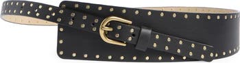 Silvery studs lend a polished effect to a faux-leather belt fashioned in an asymmetric silhouette to bring visual interest to everyday looks.