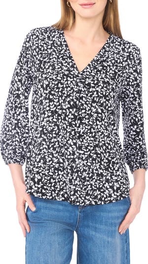 Perfect for the workday or weekend, this V-neck top is framed by puffed three-quarter sleeves and a gathered back yoke for a comfortably relaxed feel.
