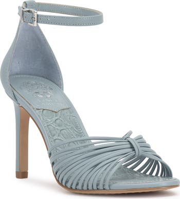 A strappy vamp heightens the contemporary allure of a striking ankle-strap sandal fashioned with a croc-embossed footbed and walkable stiletto heel.