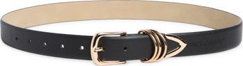 Highlight your silhouette with this faux-leather belt finished with a gleaming rounded buckle, V-shaped belt tip and double keepers.