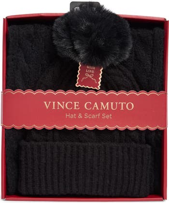 Refresh your cold-weather collection with this scarf and beanie set detailed with braided cables and a fluffy faux-fur pompom for chic style.