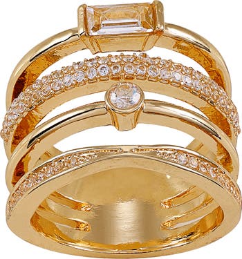 Faceted bright-white crystals give off perfect shimmer atop a a multiple-band ring complete with high-polish shine.