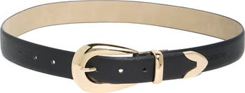 Complete your look with this textured faux-leather belt framed by gleaming hardware for a polished touch.