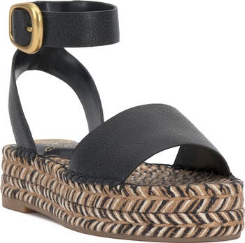 Espadrille-inspired braiding highlights the platform sole of this vacation-ready sandal topped with smooth leather straps.