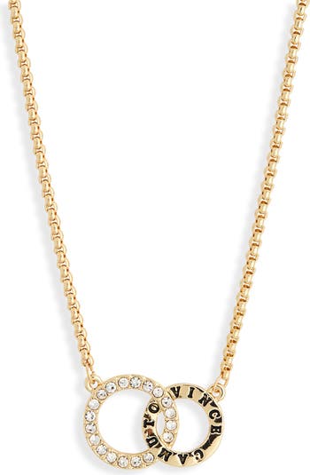 Brilliant crystals sparkle along one of two links of logo-etched necklace featured in a glossy-finish goldtone plate.