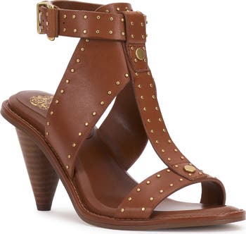 Pinpoint studs and a conical heel amplify the everyday sophistication of a T-strap sandal fashioned from richly grained leather.