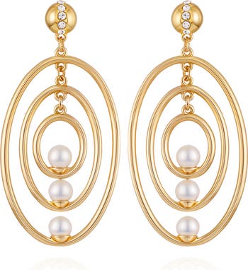 Milky faux pearls sit in the curves of these triple-circle drop earrings.