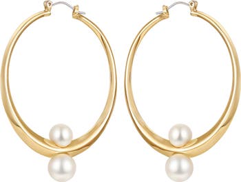 Lustrous faux pearls details the top and bottom of these frontal hoops plated in warm goldtone.