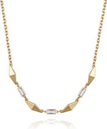 Baguette-cut crystals and diamond-shaped pendants trace the front of a dainty chain of this gleaming necklace creating an effortlessly elegant look.