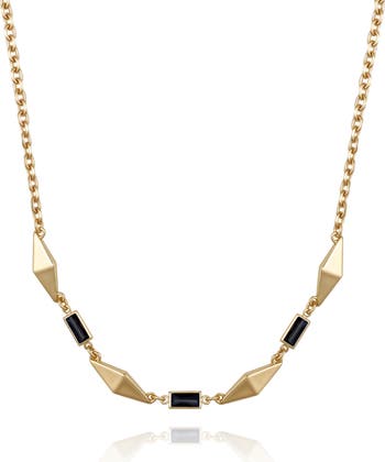 Baguette-cut crystals and diamond-shaped pendants trace the front of a dainty chain of this gleaming necklace creating an effortlessly elegant look.