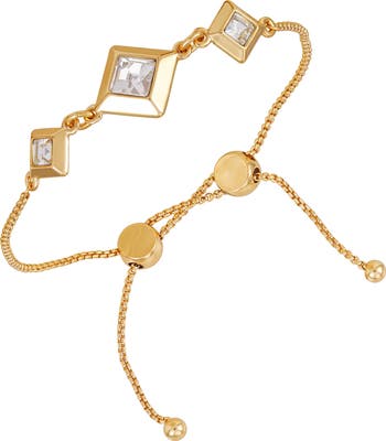 Geometric charms centered with faceted crystals draw the eye to this polished bracelet complimented by a slider closure.