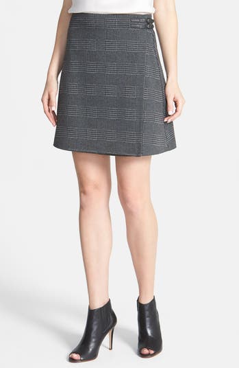 Traditional glen plaid brings on-trend menswear attitude to a leg-lengthening miniskirt in a flattering faux-wrap style with a double-tab detail at the waist side.
