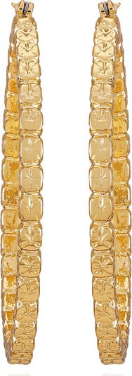 A rich texture lends depth and dimension to high-shine hoop earrings that radiate from your lobes.