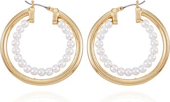 Imitation pearls lend an air of elegance to these polished hoop earrings that are gleaming with goldtone plate.