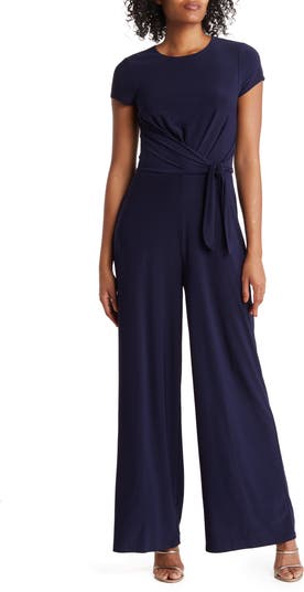 An asymmetrical tie detail adds unique style to this minimalistic, T-shirt inspired jumpsuit.