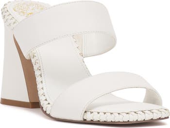 A braided midsole and angular square toe add modern intrigue to a leather slide sandal lifted by a flared block heel for statement-making height.