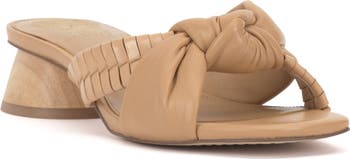 A softly flared circular block heel textured like wood brings a decidedly unique aesthetic to a leather slide sandal finished with tightly knotted toe straps.