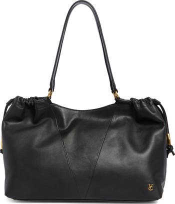 Carry your essentials in this soft leather tote bag featuring fixed shoulder straps, side drawstrings and interior pockets.