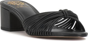 Slim, tubular straps are knotted at the vamp to add chic dimension to a slide sandal lifted on a chunky block heel.