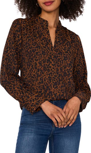 A new-neutral leopard print covers this blousy crepe top designed with a banded-collar V-neckline and framed by long sleeves with gently puffed shoulders.