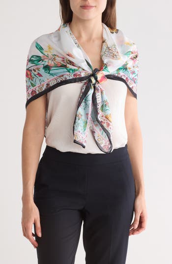 A bright floral print adds a charming finish to a satin scarf that easily elevates your look.