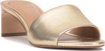 Signature logo hardware subtly brands the counter of a minimalist slide sandal rendered in rich leather and lifted by a demi block heel.