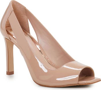 Sleek side cutouts and a squared-off open toe add visual intrigue to a rich leather pump lifted by a tapered heel.